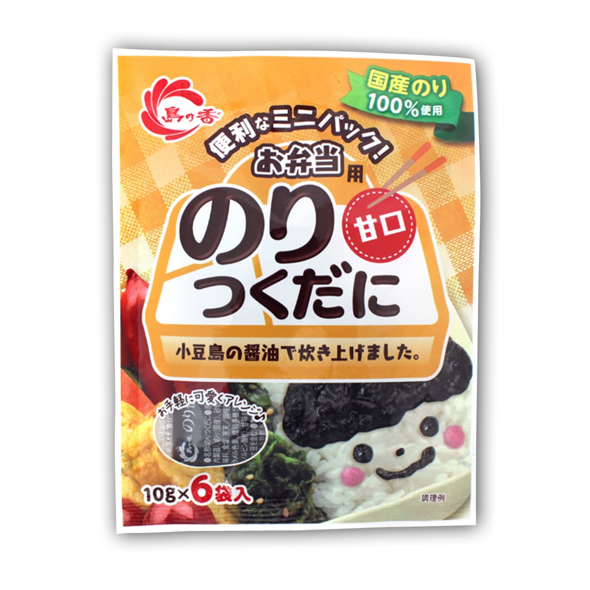 | 原材料名 | 醤油(国内製造)、のり(国産)、砂糖、水あめ、発酵調味料、食塩、 寒天/調味料(アミノ酸等)、カラメル色素、増粘多糖類、酸味料、保 存料(ソルビン酸K)、甘味料(甘草)、(一部に小麦・大豆を含む) |