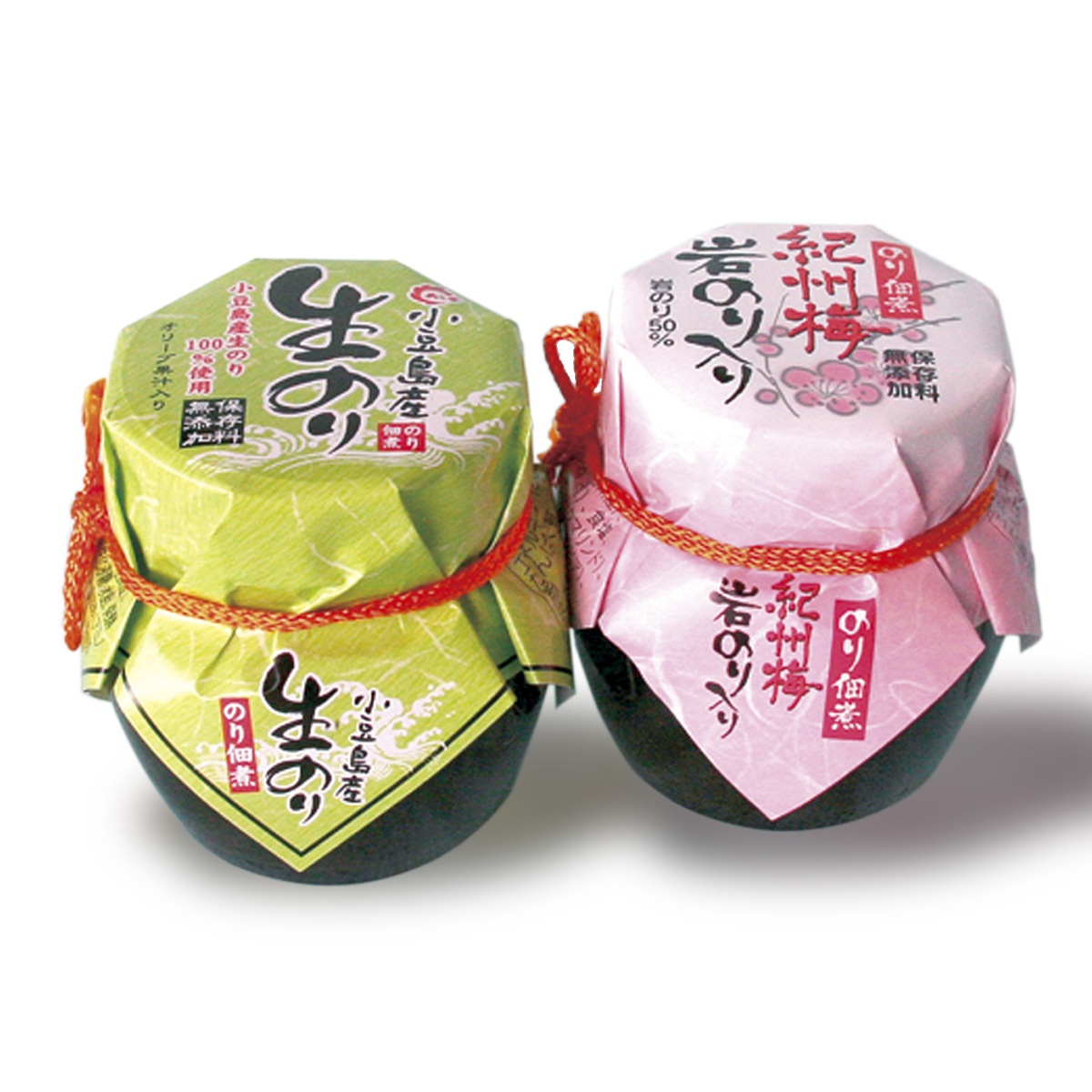 | 栄養成分(100gあたり) | 【小豆島産生のり】 エネルギー 135kcal たんぱく質 5.0g 脂質 0.2g 炭水化物 28.3g 食塩相当量 6.9g 【紀州梅岩のり】 エネルギー 128kcal たんぱく質 4.0g 脂質 0.2g 炭水化物 27.6g 食塩相当量 6.6g |